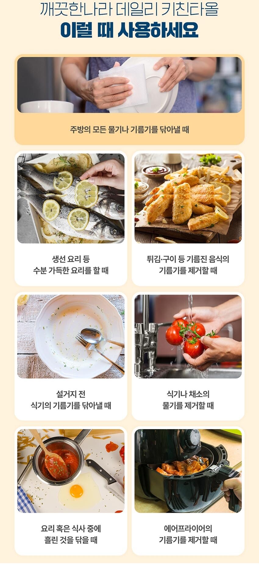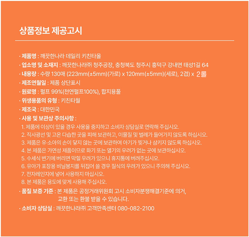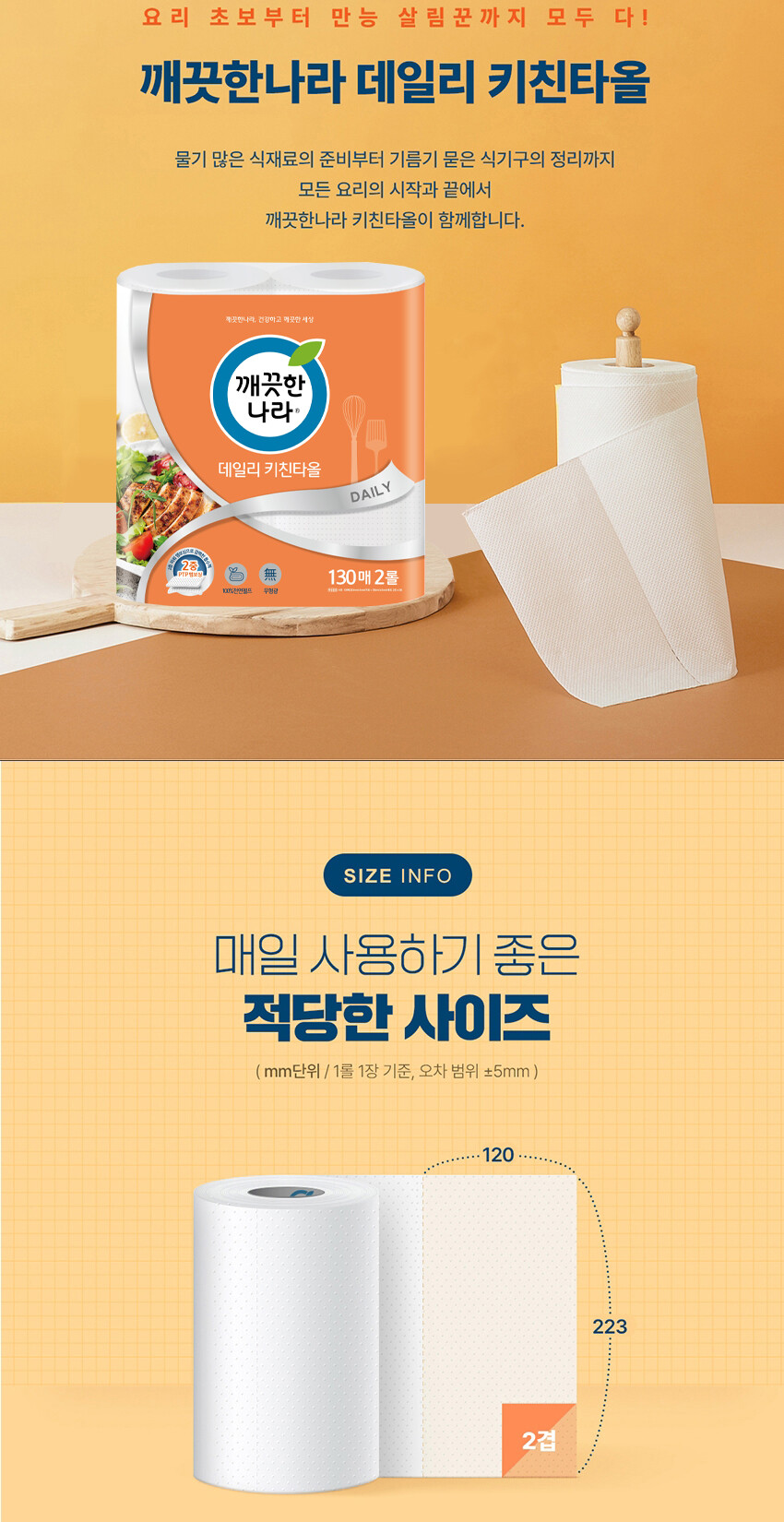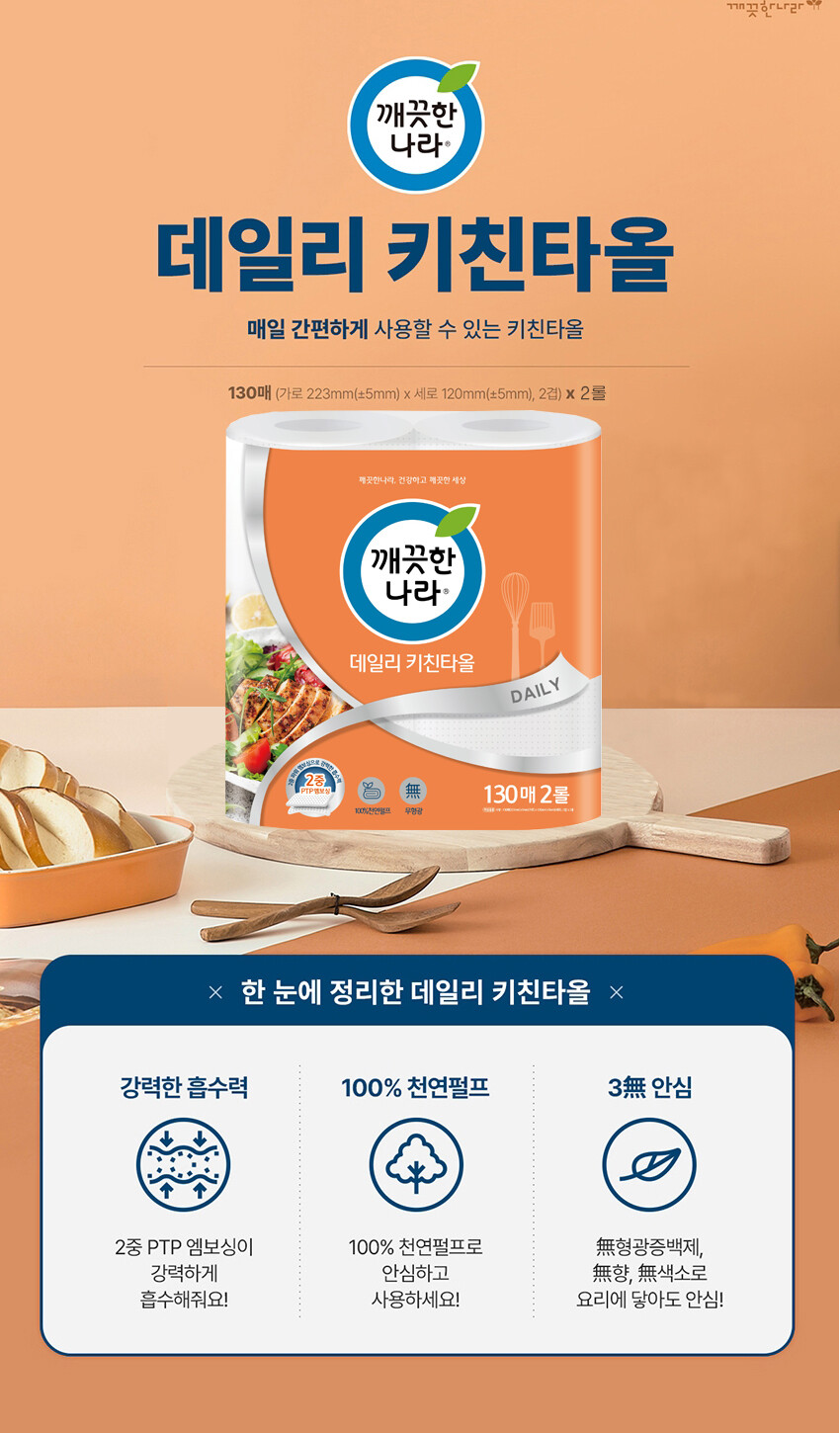 [깨끗한나라] 2겹 천연펄프 데일리 키친타올 130매 2롤X8팩